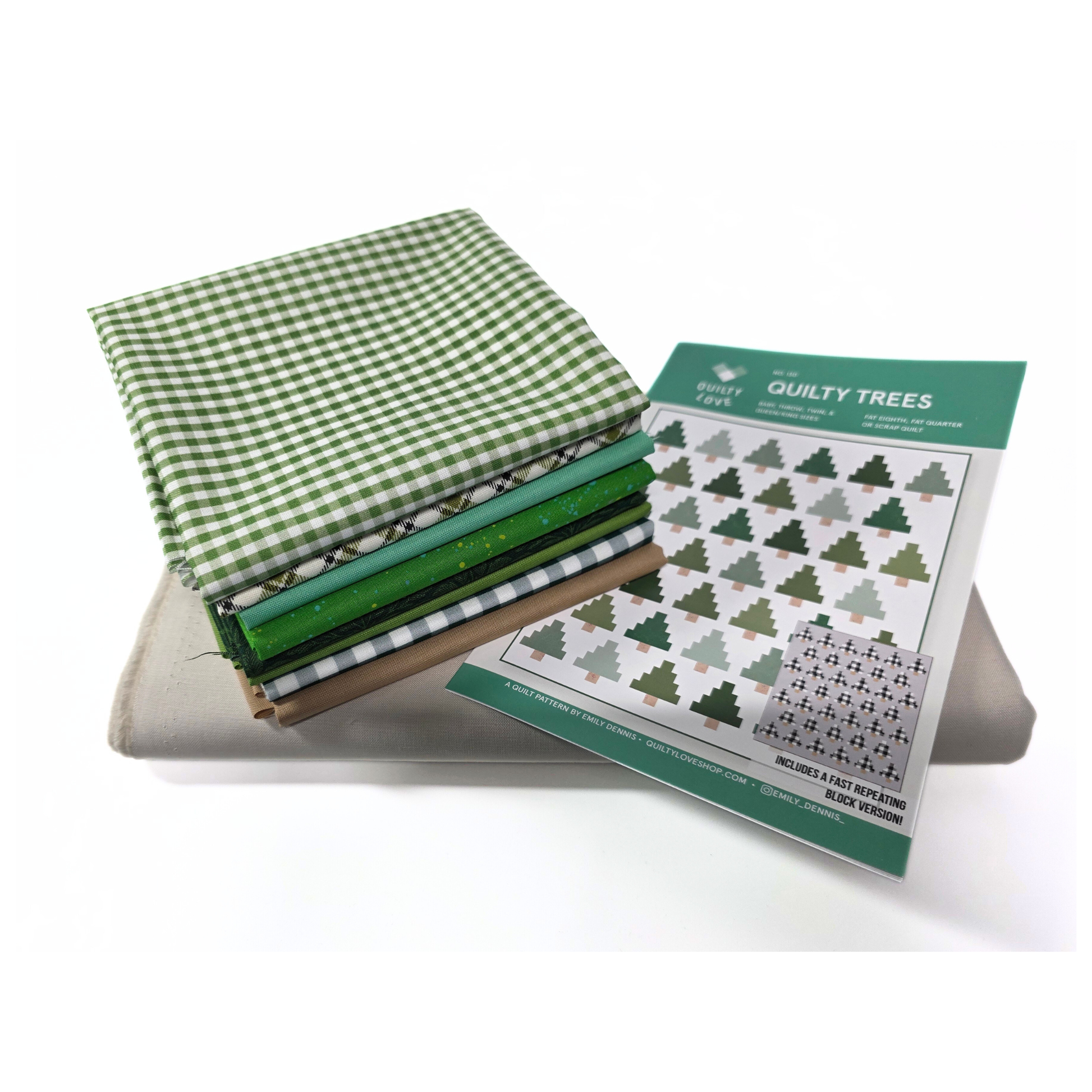 Bring a forest of charm to your sewing room! The Quilty Trees Quilt Kit features the Quilty Trees pattern by Emily Dennis of Quilty Love and a curated mix of greens, ginghams, and earthy tones — everything you need to create your own grove of modern trees.